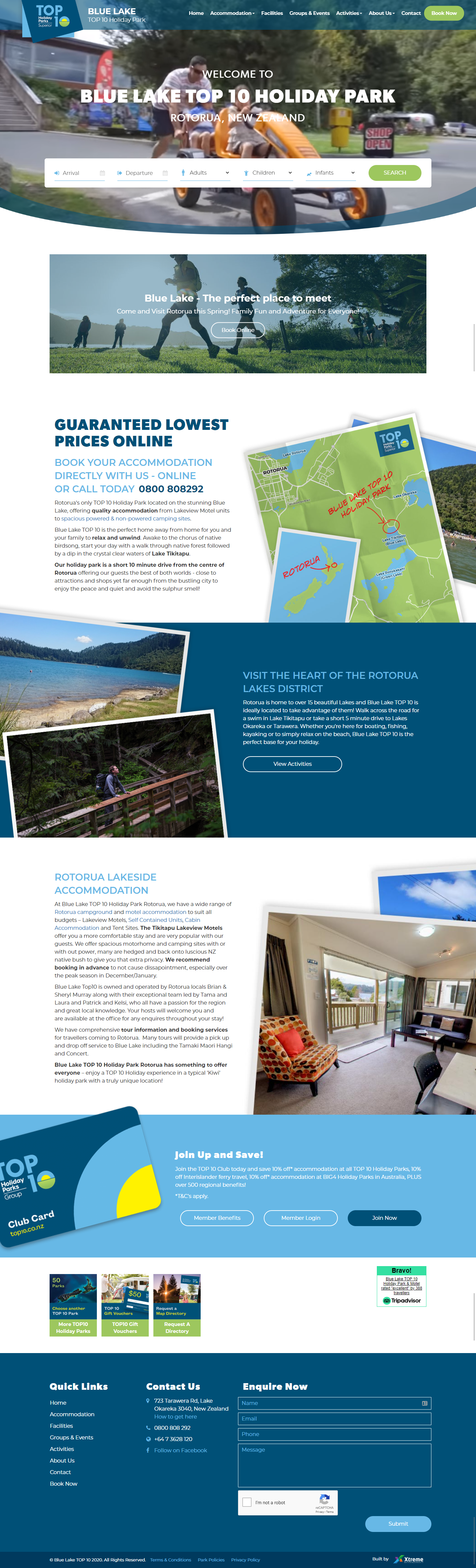 Website for a single holiday park just outside of Rotorua, NZ. Colours had to match the parent group, but otherwise the design was allowed to be customised to fit the client.
