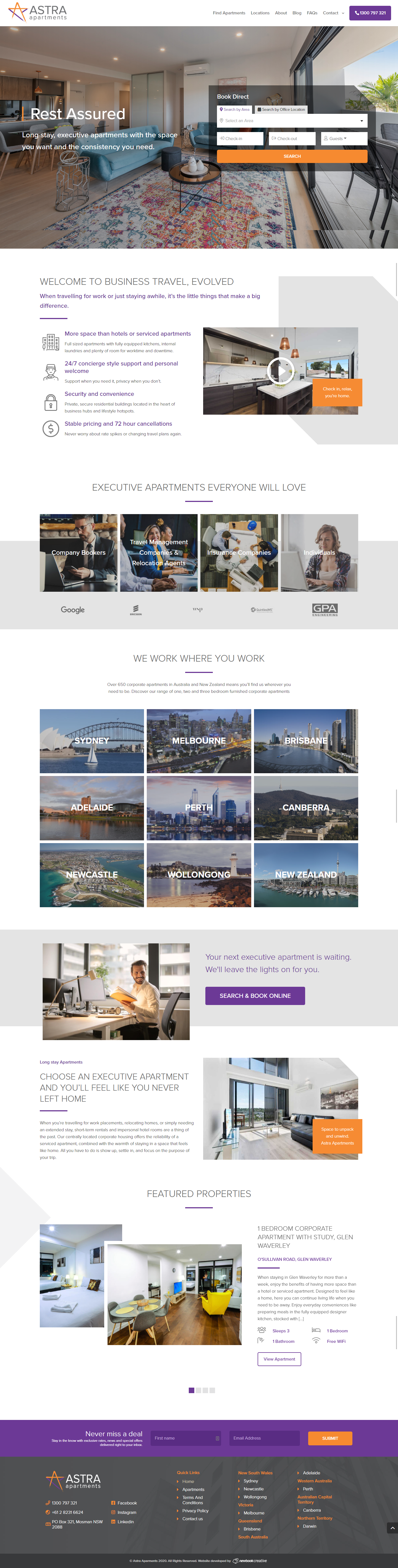 Site showcasing corporate apartments for rent across Australia. Built in WordPress, search function integrated with Google Maps/Places and availability/pricing is provided via booking engine API integration